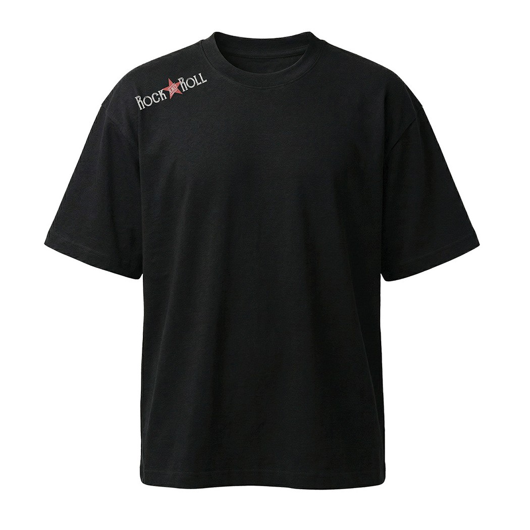 חולצת אוברסייז גברים Rock and Roll בצבע שחור מבית Rhythm Design מביאה סטייל נקי עם קריצה קלאסית לעולם הרוק. ההדפס הקטן והמדויק באזור הכתף יוצר מראה מינימליסטי עם אופי חזק ונוכחות שקטה.