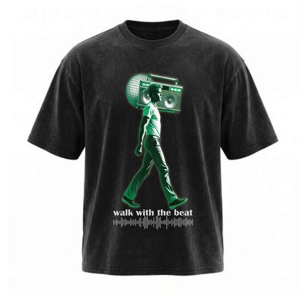 חולצת אוברסייז גברים Walk בצבע שחור מבית Rhythm Design מביאה איתה מסר ברור – ללכת עם הקצב שלך. ההדפס של הדמות עם הבום בוקס על הכתף יחד עם הכיתוב “walk with the beat” יוצר וייב אורבני, משוחרר ומלא אנרגיה.