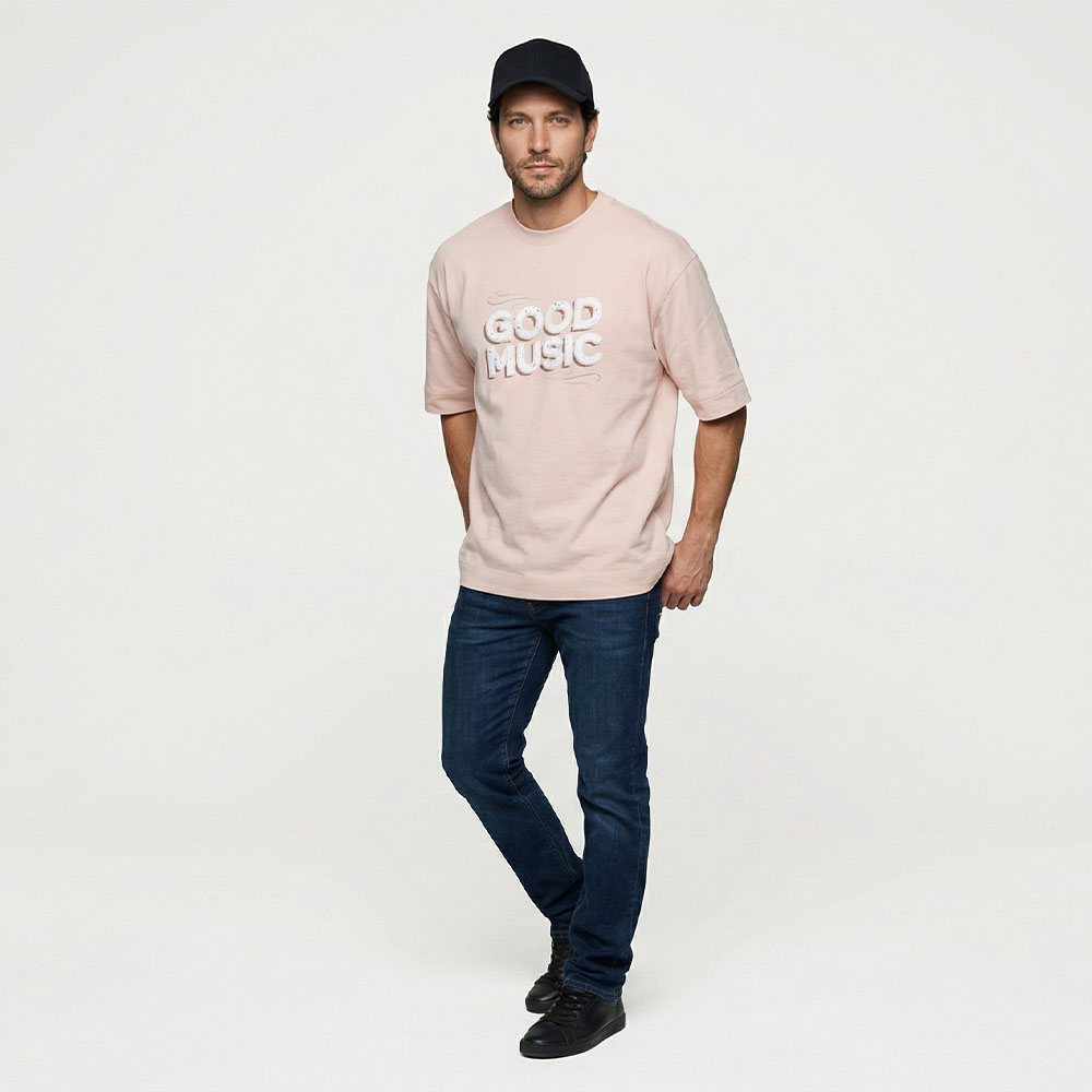 חולצת אוברסייז good music משתלבת עם גינס בהיר מכנס כהה או נעליים נקיות ויוצרת לוק רגוע עם נוכחות. היא יכולה להיות מרכז ההופעה או פריט משלים שמוסיף אופי ותחושה.