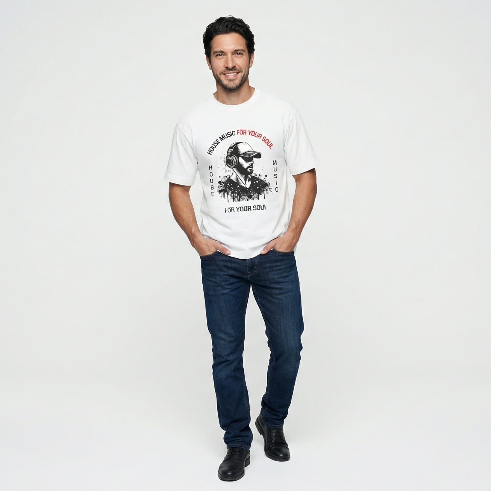 המשפט HOUSE MUSIC FOR YOUR SOUL לא מדבר רק על סגנון – הוא מדבר על חיבור. על ביט שמרים אותך, על אנרגיה שנכנסת עמוק פנימה ועל וייב שלא מתנצל. ההדפס האמנותי משלב דמות עם אוזניות בקו גרפי עוצמתי, בשחור עמוק עם נגיעת אדום חיה שמדגישה את המילים FOR YOUR SOUL – כי זו לא רק מוזיקה, זו תחושה.