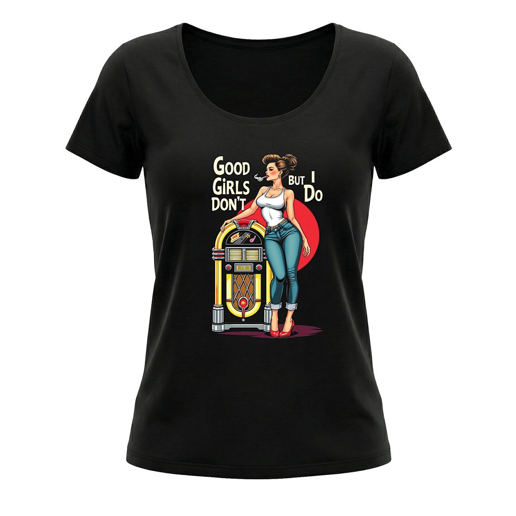 חולצת נשים Good Girls בצבע שחור מבית Rhythm Design מביאה איתה שילוב מושלם של סטייל נשי, ביטחון ואווירה רטרו-מוזיקלית. ההדפס של הדמות לצד הג’וקבוקס עם הכיתוב “Good Girls Don’t… But I Do” יוצר אמירה שובבה, נועזת ומלאת אופי.